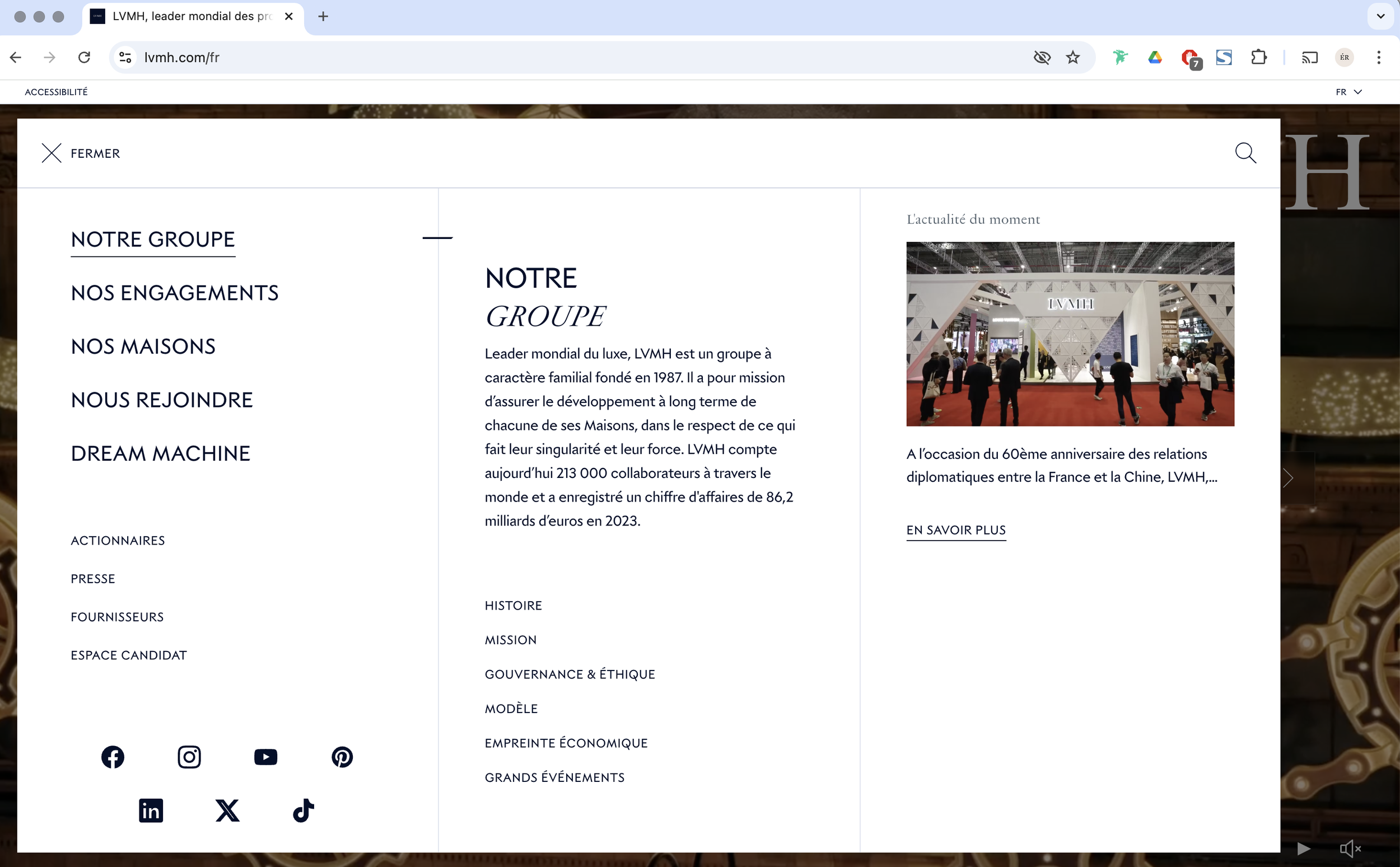 Entre 2023 et 2024, le groupe LVMH entreprend la refonte globale de son site corporate afin de renforcer sa présence en ligne et améliorer l’expérience utilisateur. Une initiative s’inscrivant dans une approche stratégique des contenus et réalisée en étroite collaboration avec l’équipe corporate du Groupe.